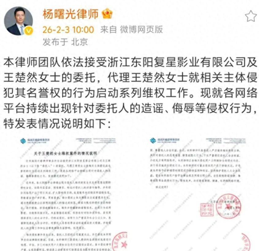北京海润天睿律师事务所发布声明称,已接受浙江东阳复星影业有限公司及王楚然委托,处理其名誉权维权事宜。声明指出,多年来网络平台充斥诸多针对王楚然的不实言论,皆是歪曲、捏造事实,构成诽谤与侮辱。部分用户为博关注、涨流量,蓄意散布未经核实的虚假信息,使谣言扩散,影响恶劣。这种影射、关联的间接方式,虽未直呼其名,但针对性极强,误导大众,降低其社会评价,严重侵犯名誉权,给她的工作和生活带来负面影响。声明提及,侵权事件发生后,王楚然及其经纪公司高度关注,委托律所启动维权措施。目前,律师已整理、评估侵权线索,保全固定相关证据。对于侵权情节严重、恶意明显者,尤其是影射侵权及经警示仍不停止侵权行为的,将依法提起民事诉讼追究责任。相关诉讼准备工作正有序推进,如有进展,律所将择时公布。律师正告侵权用户删除侵权内容,停止侵权行为,并持续关注、监测,坚决维护王楚然合法权益。随后,王楚然工作室转发声明,表示依法维护艺人权益,追责到底。此告黑声明引发网友不同看法,有人支持维权,有人疑惑其为何常被谣言缠身。