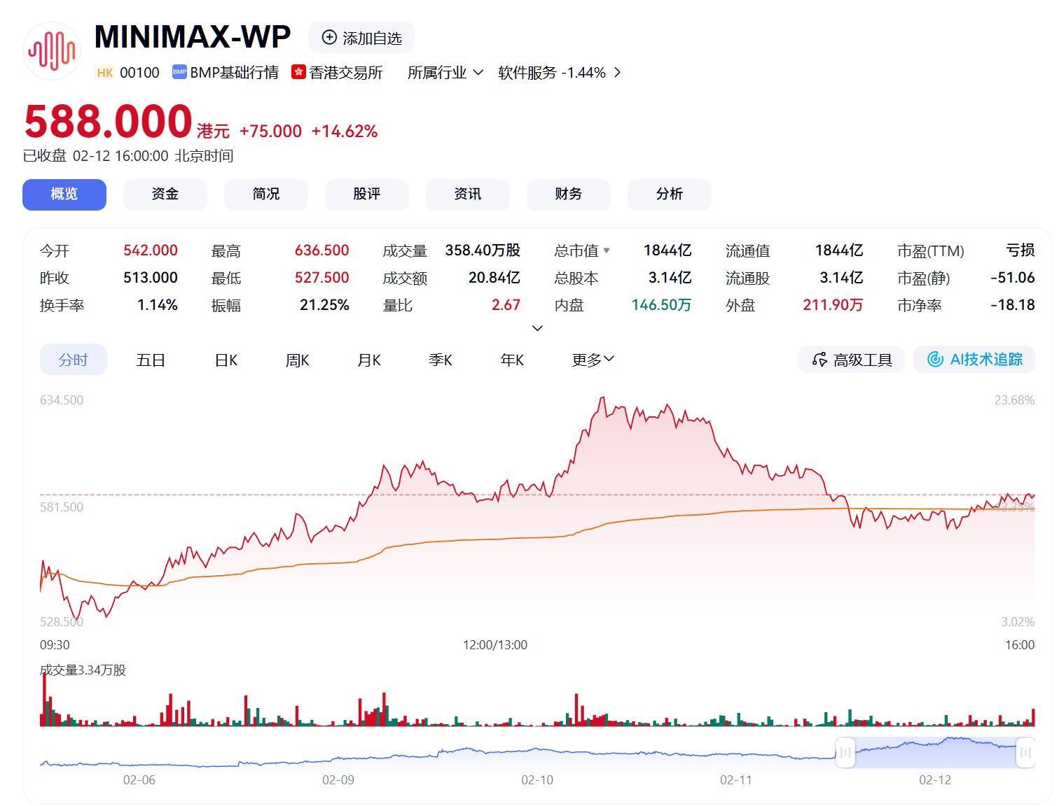 截至2月12日港股收盘,MiniMax股价涨幅14.62%,总市值1622亿人民币,其股价盘中曾一度涨幅超23.5%。根据官网信息,MiniMax将于3月2日公布全年业绩。