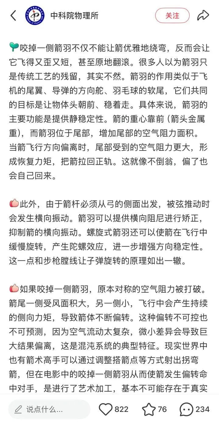 今天,中国科学院物理研究所下场进行了科普,给出了明确结论:“咬掉一侧箭羽不仅不能让箭优雅地绕弯,反而会让它飞得又歪又短,甚至原地翻滚。”